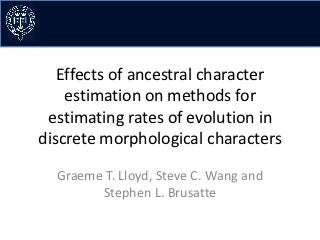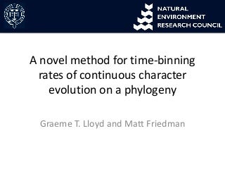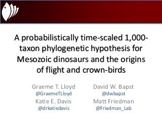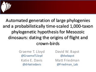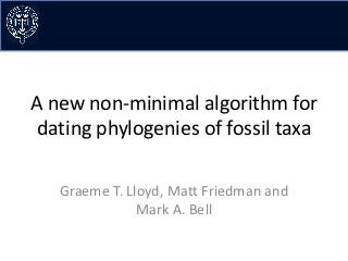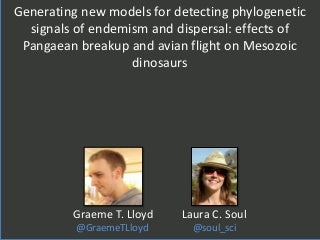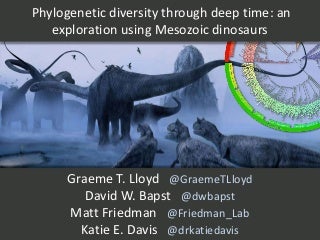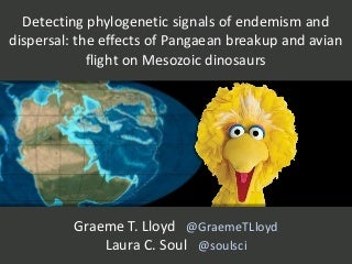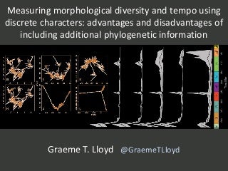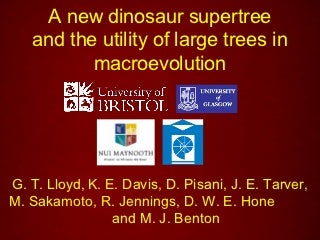 2016Lloyd, G. T., 2016. A novel metatree approach to generating large phylogenetic hypotheses of extinct taxa. Palaeo Down Under, 2, . Lloyd, G. T., 2016. Measuring morphological diversity and tempo using discrete characters: advantages and disadvantages of including additional phylogenetic information. International Congress of Vertebrate Morphology, 11, . Lloyd, G. T., Bapst, D. W., Friedman, M. and Davis, K. E., 2016. Phylogenetic diversity through deep time: an exploration using Mesozoic dinosaurs. Evolution, 32, . 2015Lloyd, G. T. and Soul, L. C., 2015. Detecting phylogenetic signals of endemism and dispersal: the effects of Pangaean breakup and avian flight on Mesozoic dinosaurs. Society of Vertebrate Paleontology Annual Meeting Program and Abstracts, , . Lloyd, G. T., 2015. Time-binning rates of continuous character evolution on a phylogeny: the origin of amniotes, not tetrapods, is characterised by increased rates. International Symposium on Early and Lower Vertebrates Abstract Volume, 13, 21. Lloyd, G. T. and Soul, L. C., 2015. Generating new models for detecting phylogenetic signals of endemism and dispersal: effects of Pangaean breakup and avian flight on Mesozoic dinosaurs. Evolution, 31, . 2014Lloyd, G. T., Bapst, D. W., Davis, K. E. and Friedman, M., 2014. Automated generation of large phylogenies and a probabilistically time-scaled 1,000-taxon phylogenetic hypothesis for Mesozoic dinosaurs: dating the origins of flight and crown-birds. PalAss Newsletter [Abstracts], , . Lloyd, G. T., 2014. New methodologies for the use of cladistic-type matrices to measure morphological disparity and evolutionary rate. Radiation and Extinction: Investigating Clade Dynamics in Deep Time. Lloyd, G. T., Bapst, D. W., Davis, K. E. and Friedman, M., 2014. A probabilistically timescaled 1,000-taxon phylogenetic hypothesis and the origins of flight and crown-birds. Society of Vertebrate Paleontology Annual Meeting Program and Abstracts, 163. Lloyd, G. T., 2014. How does Evolutionary Distinctiveness change when we place fossils in the tree? Challenges in Macroecology - Scaling the Time Barrier. 2013Lloyd, G. T., 2013. A new R package for automating cladistic ordination and the effects of phylogenetic signal on disparity measures. PalAss Newsletter [Abstracts], 84, 46. Lloyd, G. T. and Friedman, M., 2013. A novel method for time-binning rates of continuous character evolution on a phylogeny. Society of Vertebrate Paleontology Annual Meeting Program and Abstracts, 163. Lloyd, G. T., 2013. Claddis: a new R package for automating disparity analyses based on cladistic datasets. SVPCA Programme and Abstracts, 81, 41. Lloyd, G. T., Friedman, M., and Bell, M. A., 2013. Beyond the lower-bound: the fossil record can provide empirically-informed prior distributions on node ages in poorly-sampled groups. Palaeontological Association Newsletter [Abstracts], 81, 41. 2012Lloyd, G. T., Friedman, M., and Bell, M. A., 2012. A new non-minimal algorithm for dating phylogenies of fossil taxa. Palaeontological Association Newsletter [Abstracts], 81, 41. Lloyd, G. T., Friedman, M., and Bell, M. A., 2012. Confidence intervals on node age estimates in vertebrate phylogeny. Journal of Vertebrate Paleontology (Online Supplement), , . Lloyd, G. T., Wang, S. C. and Brusatte, S. L., 2012. Effects of ancestral character estimation on methods for estimating rates of evolution in discrete morphological characters. SVPCA Programme and Abstracts, 16. Lloyd, G. T., 2012. Bias in estimates of palaeobiodiversity: beyond the marine macrofossil record. The 3rd International Statistical Ecology Conference - Programme and Abstracts, 60. 2011Lloyd, G. T. and Friedman, M., 2011. 400-million years of 'fishes': a survey of sampling biases based on the UK record. Journal of Vertebrate Paleontology (Online Supplement), 145-146. 2010Lloyd, G. T., Smith, A. B. and Young, J. R., 2010. Different records give different curves: comparing deep sea and land-based palaeobiodiversity. Palaeontological Association Newsletter [Abstracts], 75, 25. Lloyd, G. T., Pearson, P. N., Young, J. R. and Smith, A. B., 2010. Comparing the deep sea rock and fossil records of coccolithophores and planktic Foraminifera. GSA Abstracts with Programs, 42 (5), 138. Lloyd, G. T., Smith, A. B. and Young, J. R., 2010. Comparing rock and fossil records in the deep sea. Third International Palaeontological Congress Programme and Abstracts, 252. Wang, S. C., Lloyd, G. T. and Brusatte, S. L., 2010. Testing for heterogeneity in rates of morphological evolution: discrete character change in the evolution of lungfish (Sarcopterygii; Dipnoi). Third International Palaeontological Congress Programme and Abstracts, 404. 2009Lloyd, G. T., Smith, A. B. and Young, J. R., 2009. Is there a rock-bias to diversity patterns in the deep sea? Palaeontological Association Newsletter [Abstracts], 72, 26-27. Lloyd, G. T., Donoghue, P. C. J. and Gough, J., 2009. Protein structural domains, the Tree of Life and the evolution of complexity. Cincinnati Museum Center Scientific Contributions, 3, 32-33. 2007Lloyd, G. T., Donoghue, P. C. J. and Gough, J., 2007. Adventures in protein world reveal the Tree of Life and the evolution of complexity. Palaeontological Association Newsletter [Abstracts], 66, 42-43. 2006Lloyd, G. T., 2006. Character acquisition through geological time. Palaeontological Association Newsletter [Abstracts], 63, 27. Lloyd, G. T., Davis, K. E., Benton, M. J., and Pisani, D. [with Sakamoto, M., Tarver, J. E., Hone, D. W. E. and Jennings, R.], 2006. A new dinosaur supertree and the utility of large trees in macroevolution. Journal of Vertebrate Paleontology, 26, 90A. Lloyd, G. T., 2006. 'Living fossil' vertebrates and rates of morphological evolution. 2nd International Palaeontological Congress, Abstract Volume 2005Lloyd, G. T., and Benton, M. J., 2005. Problems of statistically recovering tetrapod extinction events (Late Permian - Early Jurassic). 53rd Annual Symposium of Vertebrate Palaeon